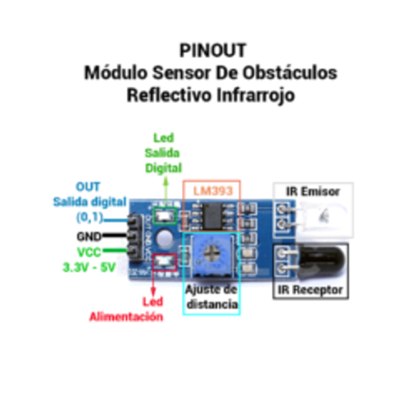 Modulo sensor con emisor y receptor  infrarrojo, posee un rango de distancia entre 2cm~30cm con un ángulo de detección de 35°. La señal captada por estos sensores es acondicionada mediante un circuito comparador, esto se ve reflejado mediante un LED indicador de color verde, en donde dependiendo de la configuración del usuario, podrá establecer niveles altos (1 lógico) y bajos (0 lógico) de tensión. así como la salida análoga de la señal del sensor esto depende de la distancia y la exposición del sensor a la luz y al obstáculo.