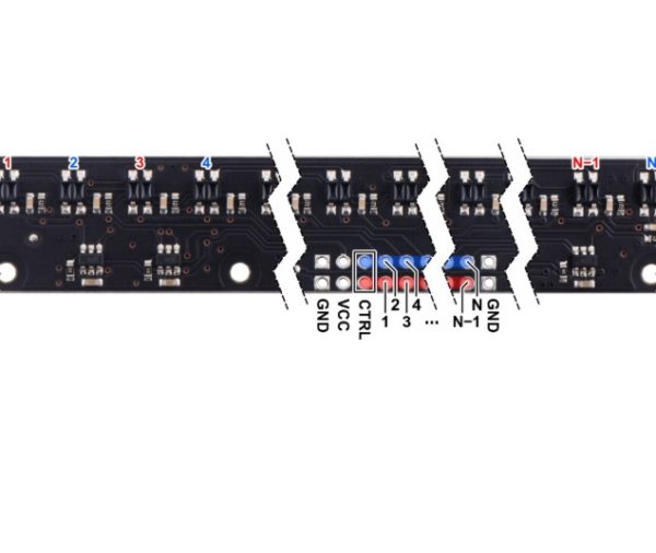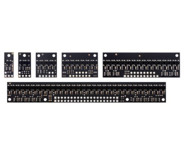 A diferencia de nuestros módulos de sensores QTR originales, estas unidades tienen controladores LED integrados que proporcionan un control de brillo independiente de la tensión de alimentación, que puede ser de 2,9 V a 5,5 V, al tiempo que permite la atenuación opcional a cualquiera de las 32 configuraciones de brillo posibles. Para los módulos de alta densidad (HD) con cinco o más sensores y los módulos de densidad media (MD) con once o más sensores, hay controles separados para los LED de números impares y pares, lo que le brinda opciones adicionales para detectar la luz reflejado en varios ángulos.