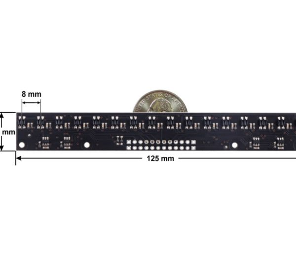 Este conjunto de pares de LED IR / fototransistor es ideal para identificar con precisión los cambios en la reflectancia (como la detección de línea). Funciona de 2.9 V a 5.5 V y ofrece un control de brillo regulable independiente del voltaje de alimentación y controles separados para los emisores pares e impares. En general, cuanto más cerca está el objeto, mayor es el contraste entre las lecturas claras y oscuras, pero los objetos de alta reflectancia son generalmente detectables al rededor de los 50 mm . Esta versión presenta los sensores QTR de estilo tradicional sin lentes.