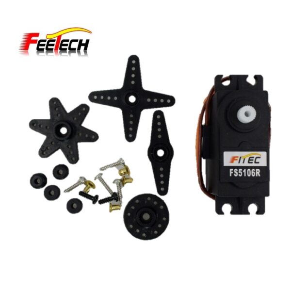 El FS5106B es un servo analógico de tamaño estándar de uso general de FEETECH. El eje de salida está soportado por dos cojinetes de bolas para reducir la fricción. El FS5106B funciona con pulsos de servo RC estándar, proporcionando un ángulo de funcionamiento de aproximadamente 180 ° en un rango de pulso de servo de alrededor de 700 µs a 2300 µs, y tiene un cable de 12 ″ (30 cm) que termina con un estilo JR estándar.